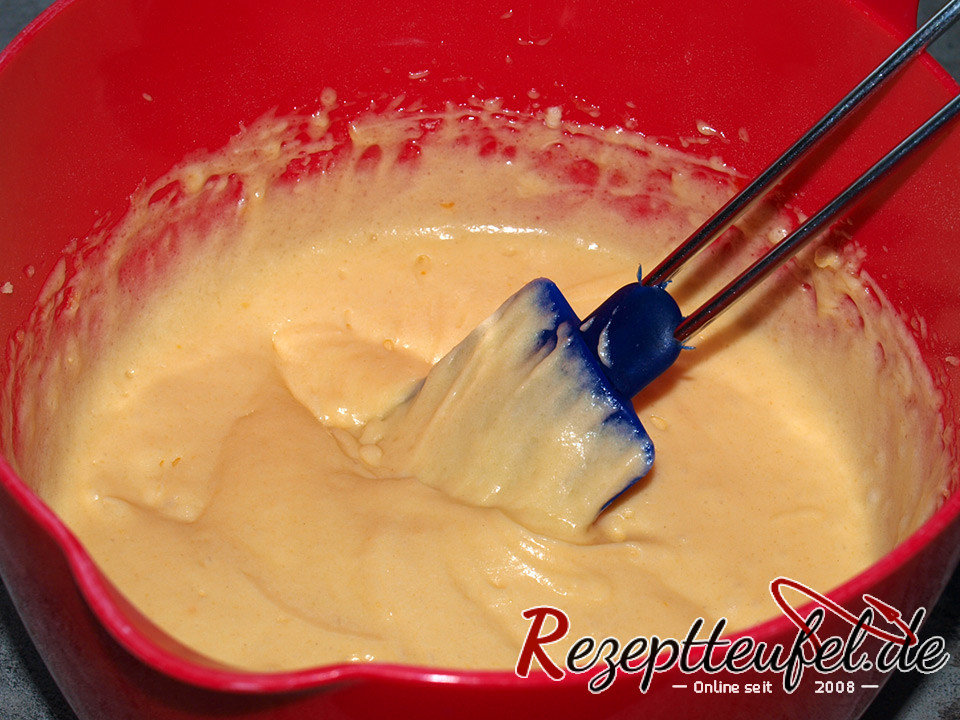- Die Zutaten für den Grundteig in eine Schüssel geben und zügig zu einem glatten, relativ flüssigen Teig verrühren.