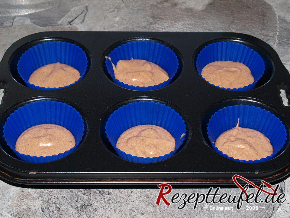 - 12 Muffin-Papier-Backförmchen in ein Muffinblech für 12 Muffins setzten und den dunklen Teig gleichmäßig in die Formen verteilen.