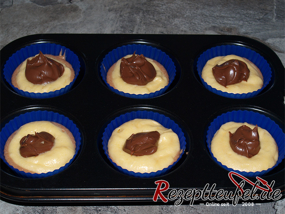 - Nun wird jeweils ein Klecks von der Nuss-Nougatcreme obenauf gesetzt, auch hier findet kein Unterrühren oder ein Eindrücken in den Teig statt.