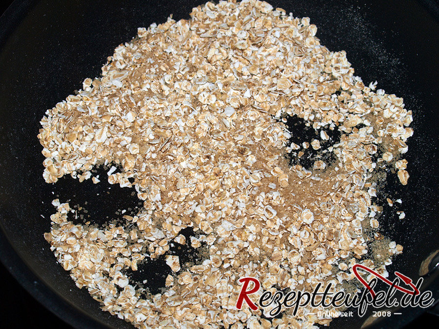- Für das Hafertopping 40 Gramm feine Haferflocken mit 40 g Zucker in eine beschichtete Pfanne geben und ganz leicht anrösten.