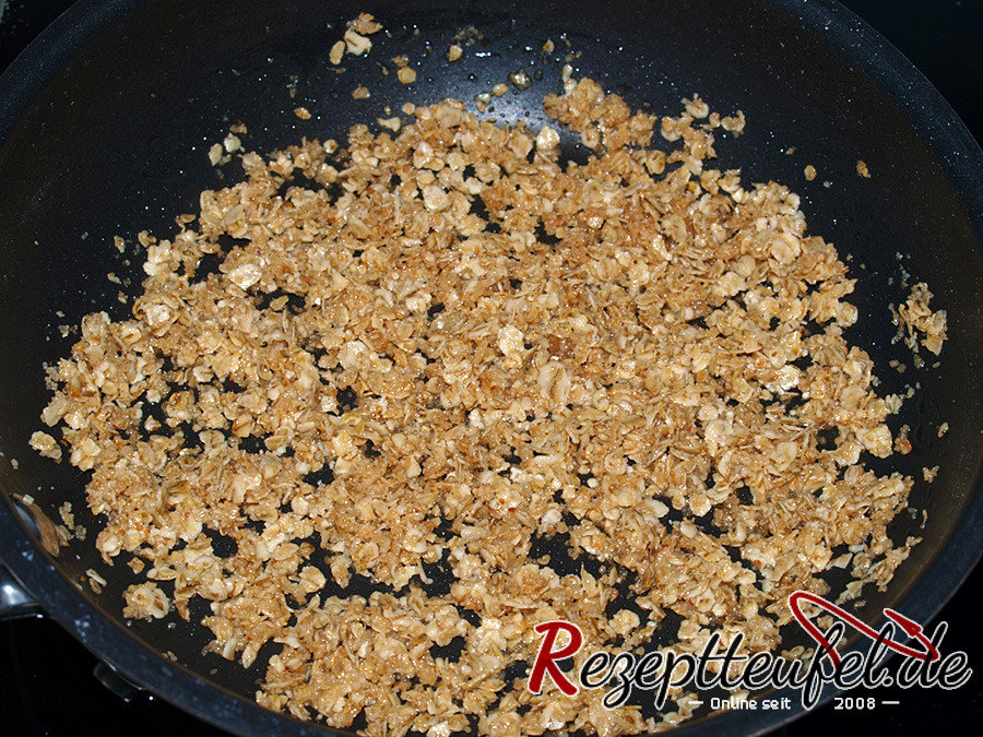 - Die Butter zu den Haferflocken geben, schmelzen lassen und die Pfanne sofort von der Kochstelle nehmen (das Topping bekommt durch die Hitze im Backofen noch mehr Röstaroma).