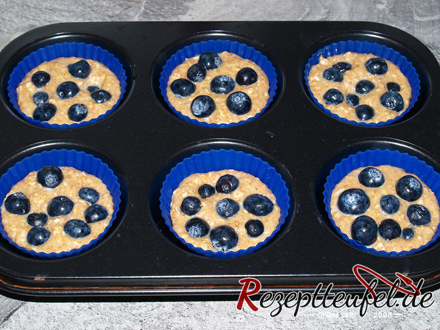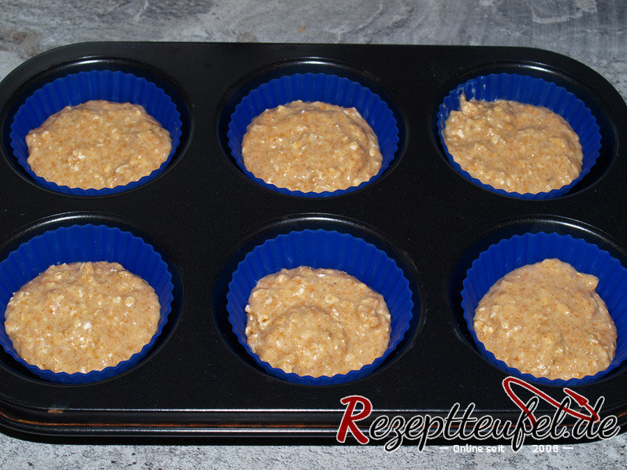 - Den Teig in ein mit Papiermanschetten oder Silikon Muffinformen ausgelegte Muffinblech (für 12 Muffins) geben.