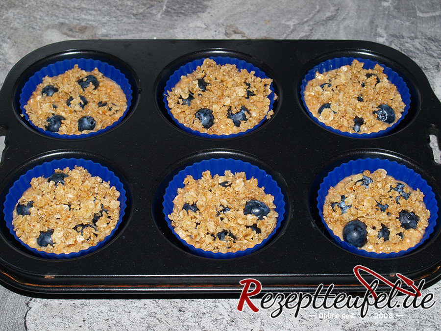 Blaubeermuffins mit Haferknusperle sind Muffins welche aus Weizenvollkornmehl und mit einem Topping aus Haferflocken gebacken werden.