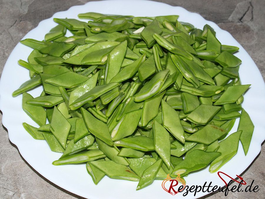 - Die Bohnen waschen, die Enden kappen und schräg in ca. 1-2 cm Rauten schneiden und die Mettwurst in Scheiben schneiden. Die Brühe in einem größeren Topf zum Kochen bringen und dann die Bohnen und die Mettenden hineingeben und ca. 20 Minuten kochen.500 g Buschbohnen, 4 Mettenden, 2 Liter Brühe