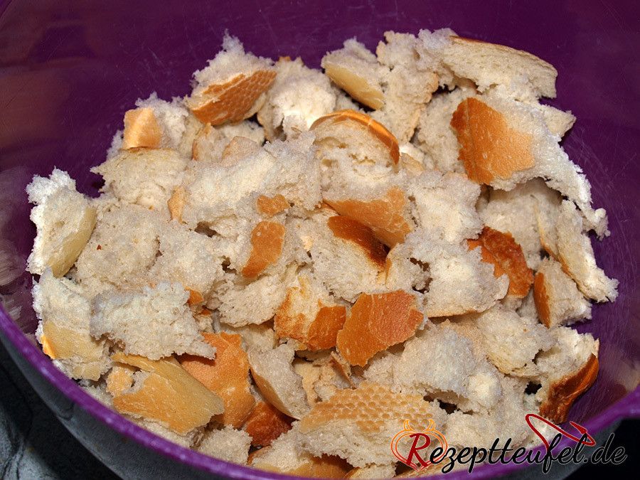 - Für die Brotspotzen werden die Brötchen in kleine Stücke zerrupft und mit dem Ei, dem Mehl und der Milch vermengt. Mit Muskat abschmecken.2 Brötchen, 1 Ei, 50 g Mehl, 125 g Milch, 1 Msp geriebene Muskatnuss