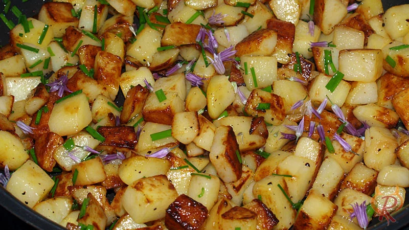 - Gebratene Kartoffelwürfel mit Schnittlauch und Schnittlauchblüten