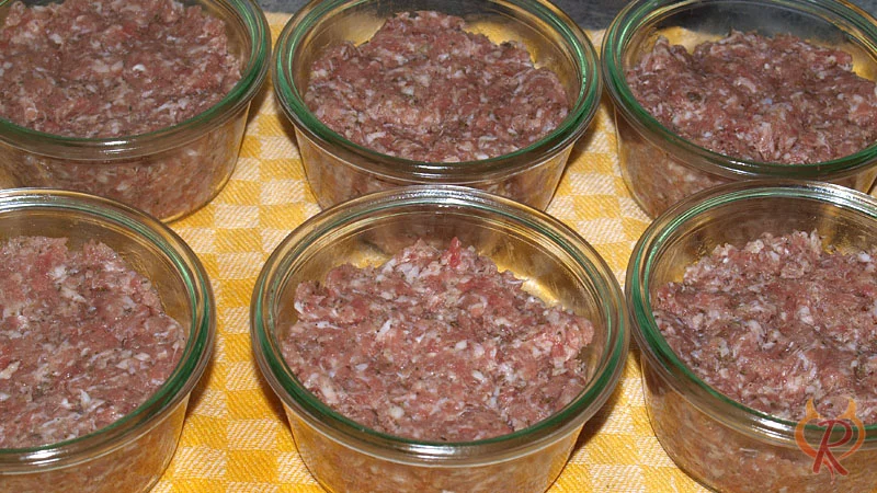 Selbst zubereitete Bratwurstmasse vom Schwein wird im Glas eingekocht. Ein typisch fränkisches Rezept.