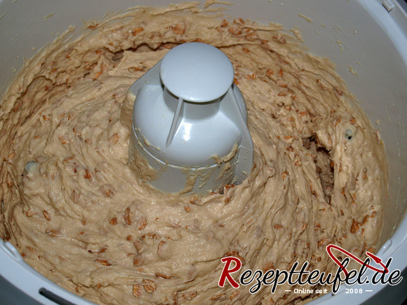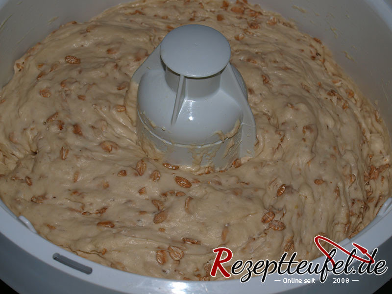 - Die Mehle mit den Dinkelflocken und dem Salz in einer Schüssel vermischen, die lauwarme Buttermilch und die zerbröckelte Hefe hinzufügen. Die Zutaten zu einem feuchten, glatten Teig verkneten.