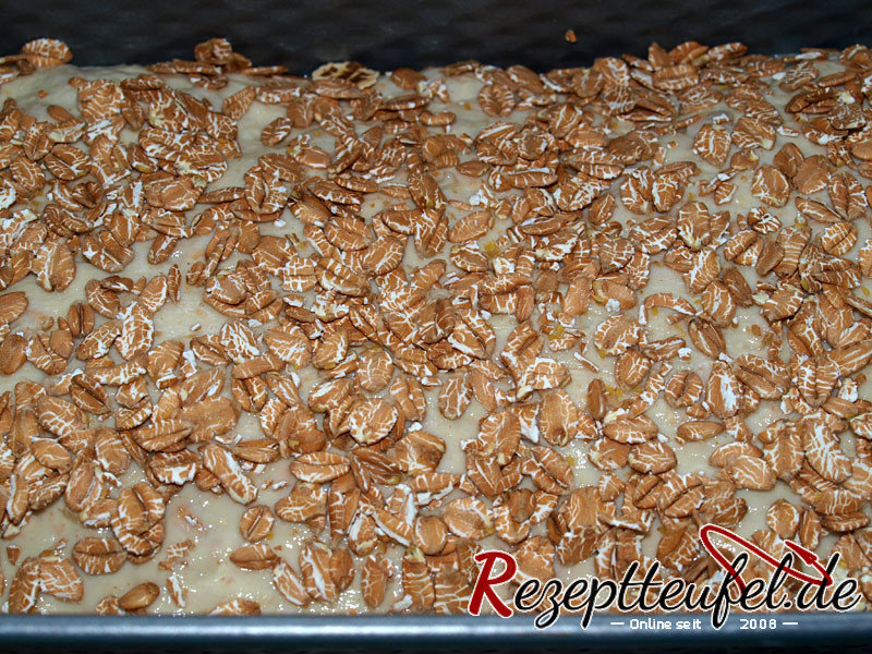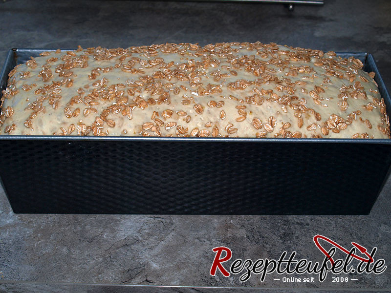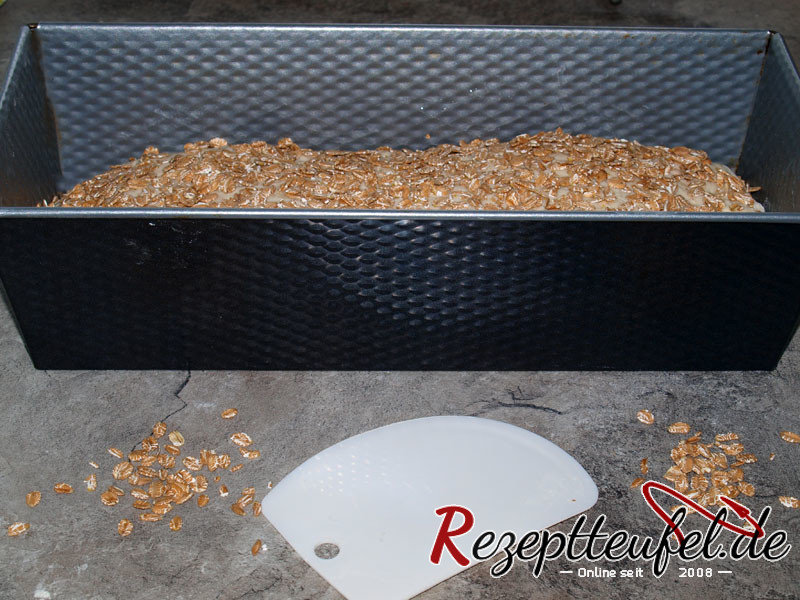 - Die Rolle in eine kastenförmige Backform von 35 cm Länge legen. Die Oberfläche befeuchten und mit den Dinkelflocken bestreuen.
