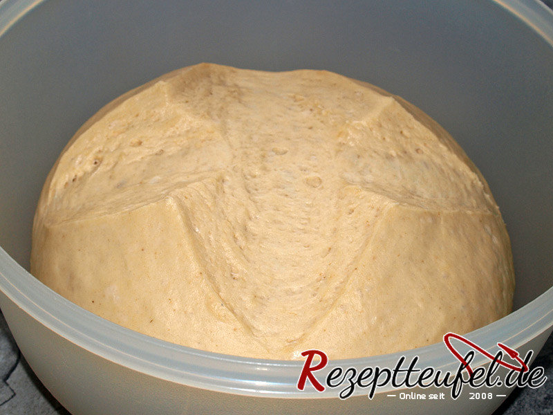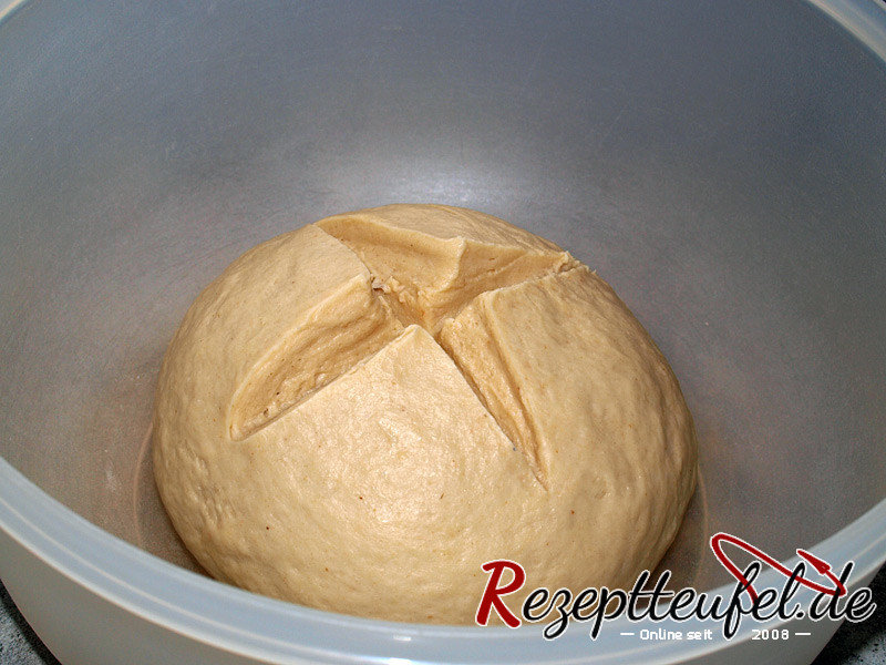 Hinweis: Die Gehzeiten können je nach Umgebungstemperatur variieren. Der Teig sollte eher nach „Augenmaß“ als stur nach Zeit gehen.
