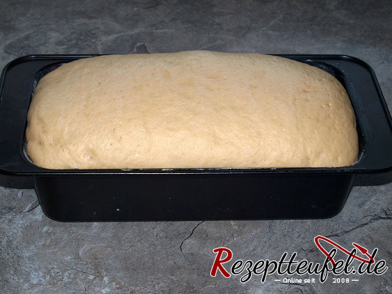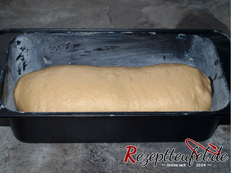 - Den Teig nochmals durchkneten und zu einer Rolle formen, diese in eine gefettete Kastenform von ca. 30 cm Länge geben. Abgedeckt nochmals ca. 40 Minuten gehen lassen, bis sich das Volumen wieder verdoppelt hat.