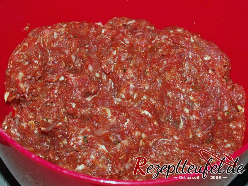 - Den Knoblauch schälen und in feine Würfel schneiden. Mit allen Zutaten in eine Schüssel geben und einige Minuten durchkneten bis die Masse anfängt leicht zu verkleben.1 kg Hackfleisch, 3 Zehen Knoblauch, 1 TL Bohnenkraut, 2 TL Salz, 0.5 TL schwarzer Pfeffer, 2 TL Paprikapulver, 0.5 TL Chiliflocken, 4 EL Mineralwasser