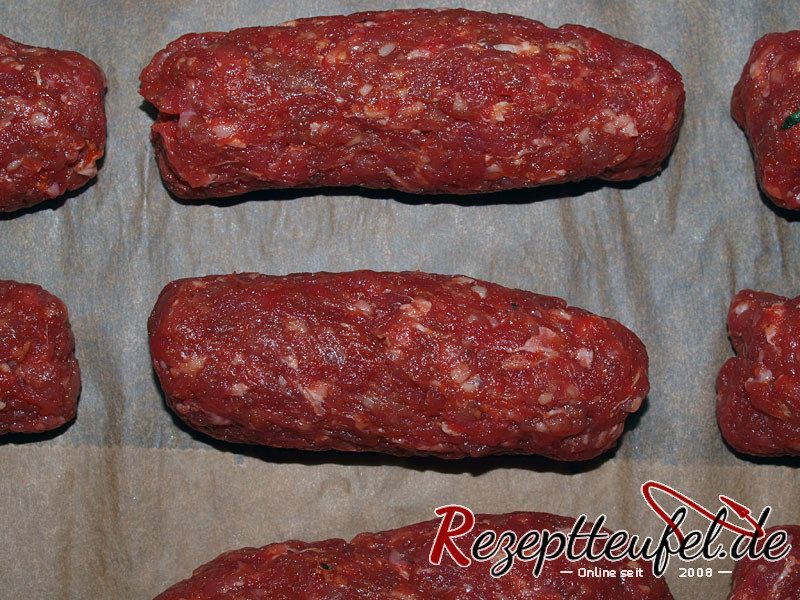 - Aus der Hackfleischmasse 20 gleichmäßige Röllchen von ca. 7 cm formen und diese auf ein mit Backpapier ausgelegtes Backblech legen.
