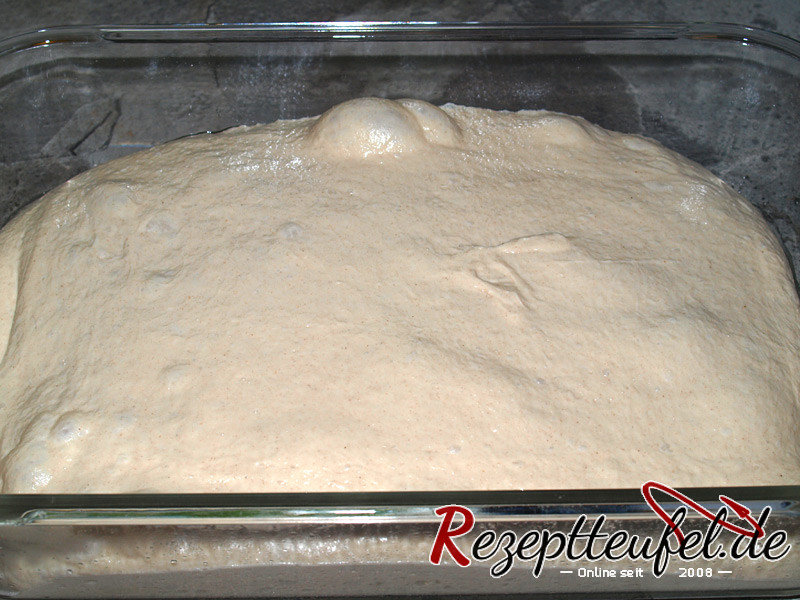 Hinweis: Der Teig geht während der letzten Ruhephase nicht mehr sichtbar auf. Umso erstaunlicher ist der gigantische Ofentrieb. Das Volumen vermehrt sich im Backofen um ein mehrfaches.