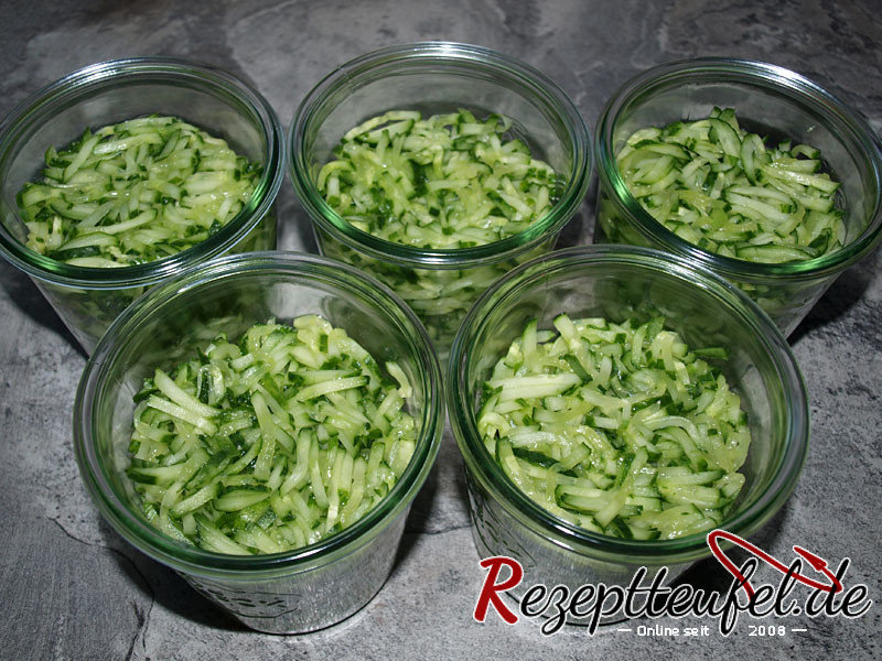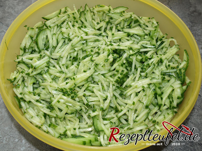 - Die Gurken gründlich waschen, die Enden abschneiden und die Gurken über einen Hobel in Stifte schneiden. Mit dem Salz bestreuen und 2 Stunden zur Seite stellen, damit die Gurken Wasser ziehen.