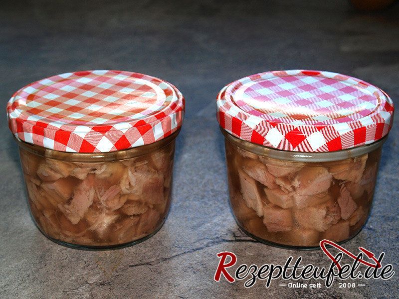 - Die Sturzgläser zuerst mit dem heißen Fleisch befüllen und dann bis 3 cm unter den Rand mit dem Sud aufgießen.Die Gläser im Einkochautomat 120 Minuten bei 100 °C einkochen.