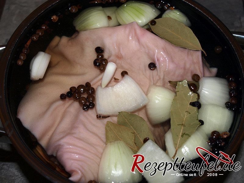 - Das Fleisch aus dem Sud nehmen, vom Knochen lösen, die Schwarte und die Knochen wieder in den Sud geben und kräftig kochen.Während dessen das Fleisch in kleine Würfel schneiden.