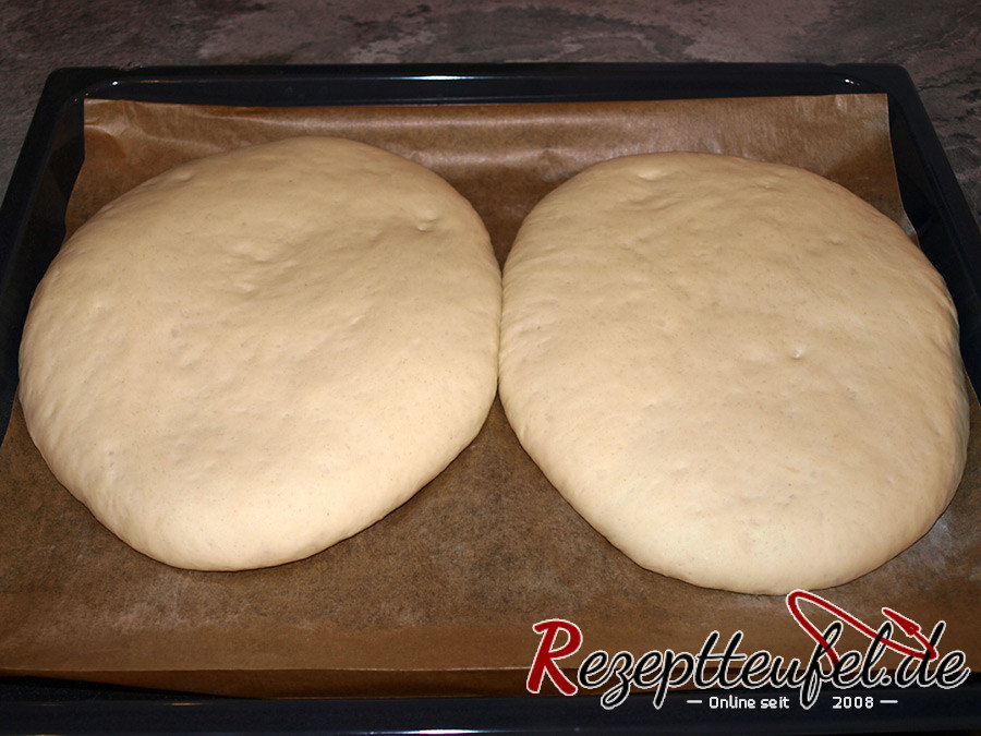 - Den Teig in 2 Stücke teilen, jeweils auf einer bemehlten Arbeitsfläche zu zwei ca. 3 cm dicken Kreisen ausrollen und auf 2 bereit gelegte Stücke Backpapier geben, gehen lassen bis sich das Volumen des ersten Teigkreises verdoppelt hat.