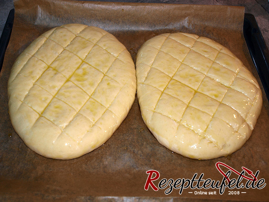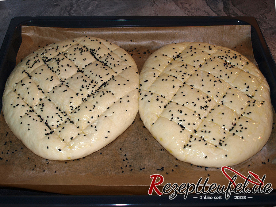 - Mit dem andern Teigkreis ebenso verfahren wie vorher beschrieben. Die Teigfladen können auch mit Schwarzkümmel bestreut werden.