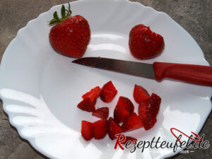 - Die Erdbeeren vorsichtig unter Wasser waschen, damit anhaftender Schmutz entfernt wird. Mit einem Messer die Blätter von den Erdbeeren entfernen und die Erdbeeren in kleine Stücke schneiden.
