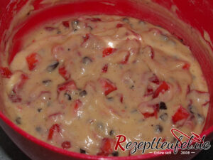 - Alle Zutaten für den Teig in eine Schüssel geben und mit einem Schneebesen oder einem Handrührgerät (Rührbesen) zu einem glatten Teig vermengen.