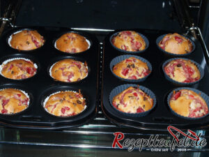 - Den Teig gleichmäßig in ein mit Papiermanschetten oder Silikon Muffinformen ausgelegtes Muffinblech (für 12 Muffins) verteilen.