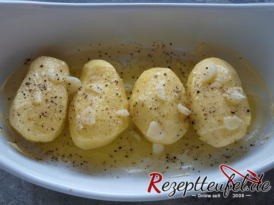 Außerdem sind sie abwechslungsreich, denn diese Kartoffeln können statt mit normaler Butter auch mit Kräuterbutter übergossen. Oder mit Knoblauchscheiben (wie hier im Rezept auf den Bildern zu sehen ist) verfeinert werden. Nach dem Garvorgang mit fein geschnittener Petersilie oder Schnittlauchröllchen bestreut ergibt sich eine weitere Geschmacksvariante.