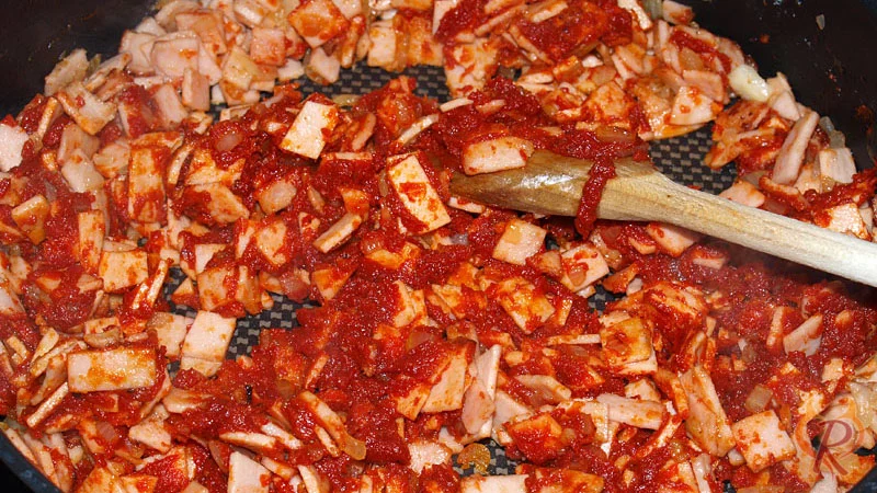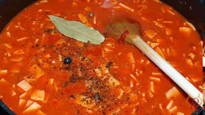 Eine Tomatensoße aus Tomatenmark hergestellt, mit Gewürzen wie Wacholderbeeren, Pimentkörner, Gewürznelken und Lorbeerblatt verfeinert.