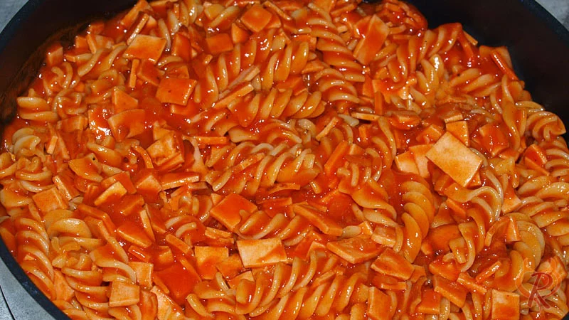 Fleischwurstsoße mit Pasta (im Volksmund Nudeln genannt) ist eine etwas andere Art einer Tomatensoße und schmeckt auch hervorragend, wenn eine Fleischwurst mit Knoblauch verwendet wird. Die Tomatensoße wird aus Tomatenmark zubereitet und mit Gewürzen wie Wacholderbeeren, Pimentkörnern, Gewürznelken und Lorbeerblatt verfeinert. Damit die Gewürze ihren Geschmack an die Soße abgeben können, muss die Soße ca. 20 Minuten ziehen.