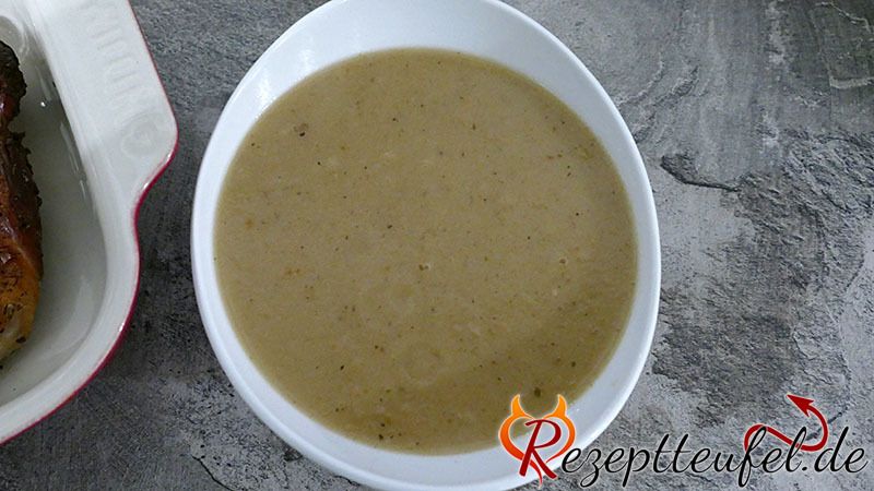 - Den gesamten Inhalt aus dem Bratschlauch in einen Topf geben. Eventuell zu viel vorhandenes Gänsefett abschöpfen. Die Flüssigkeit mit den Zwiebeln und Äpfeln pürieren und die Soße eventuell mit Wasser bis zur gewünschten Konsistenz aufgießen. Je nach Bedarf noch mit Salz und Pfeffer nachwürzen.Salz, schwarzer Pfeffer