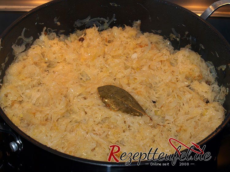 - Das Öl in eine beschichtete Pfanne geben und die halben Zwiebelringe darin andünsten. Das Sauerkraut auflockern und mit den Gewürze wie Lorbeerblatt, Wacholderbeeren, Pimentkörner und Zucker zu den Zwiebeln in die Pfanne geben.Den Deckel auf die Pfanne geben und das Sauerkraut auf mittlerer Hitze schmoren lassen, zwischendurch immer wieder umrühren. Der Vorgang dauert ca. 45 Minuten.Sobald das Sauerkraut Farbe angenommen hat die Mettwurststücke hinzufügen und unterheben, weitere 10 - 15 Minuten schmoren. Während dieser Zeit muss öfters umgerührt werden denn das Sauerkraut neigt dazu schnell eine sehr dunkle Farbe anzunehmen und wird somit leider auch bitter.850 g Sauerkraut, 5 EL Öl, 1 Lorbeerblatt, 2 Wacholderbeeren, 2 Pimentkörner, 3/4 TL Zucker