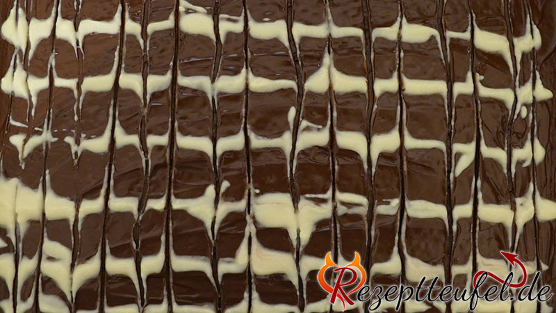 - Die Zartbitter-Kuvertüre auf den lauwarmen Kuchen geben und gleichmäßig damit überziehen. Von der unteren Schweißnaht des Gefrierbeutels eine winzige Ecke abschneiden und mithilfe dieses "Spritzbeutels" dünne und gleichmäßige Streifen auf die Zartbitter-Kuvertüre spritzen. Mit einem Holzstäbchen (Zahnstocher oder Schaschlikspieß) abwechselnd von oben nach unten und dann von unten nach oben durch die Kuvertüre gehen, sodass ein Wellenmuster entsteht.