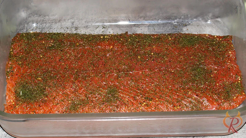 - Nach der Zeit (24 Stunden) im Kühlschrank den Beutel aufschneiden und die Würzmischung unter kaltem Wasser abwaschen. Den Lachs trocken tupfen, in eine große Schale legen und mit getrocknetem Dill bestreuen. Die abgedeckte Schale nochmals 24 Stunden in den Kühlschrank stellen und den Lachs für einen noch besseren Geschmack reifen lassen.