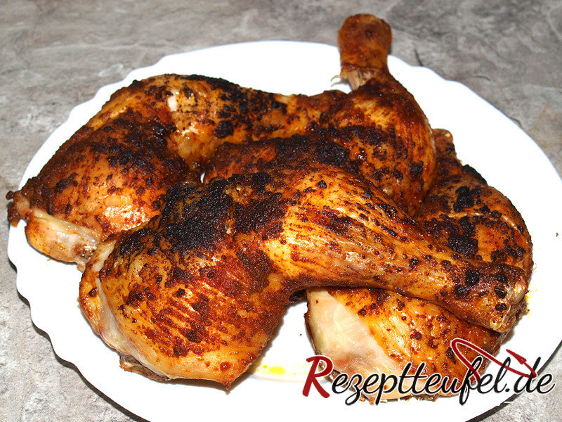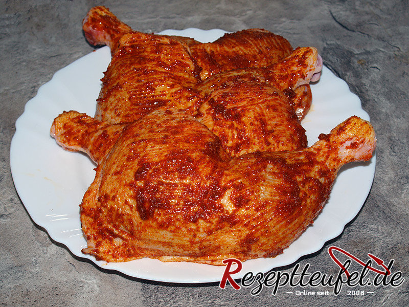 - Alle Zutaten vermengen und die Hähnchenschenkel oder das ganze Hähnchen damit bestreichen.