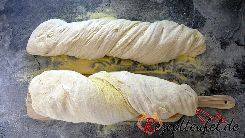 Den Teig vorsichtig aus dem Behältnis auf die gut mit Grieß bestreute Arbeitsfläche kippen. Den Teig auch an der Oberfläche mit Grieß bestreuen, zu einem relativen Rechteck ziehen bzw. zusammenschieben und mit einer Teigkarte der Länge nach in 2 längliche Stücke teilen. Die langen Teigstücke 3 bis 4 mal in sich verdrehen. Eine verdrehte Teigrolle vorsichtig auf einen länglichen Brotschieber oder Pizzaschieber geben.
