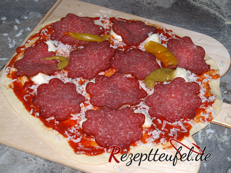 Die Salami auf der Pizza verteilen und zum Schluss die abgetropften Peperoni dazu geben.
