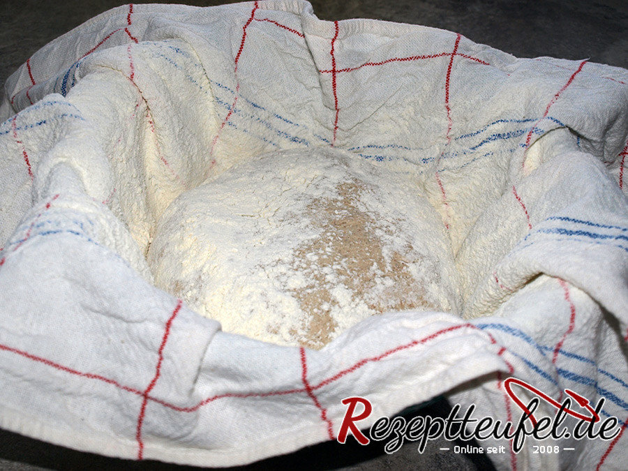 - Den Teig nochmals durchkneten, zu einem Teigkloß formen und diesen mit der Unterseite nach oben auf das bemehlte Tuch in die Schüssel bzw. das Gärkörbchen geben. Den Teig nochmals ca. 60 Minuten gehen lassen, bis sich das Teigvolumen deutlich vermehrt hat.