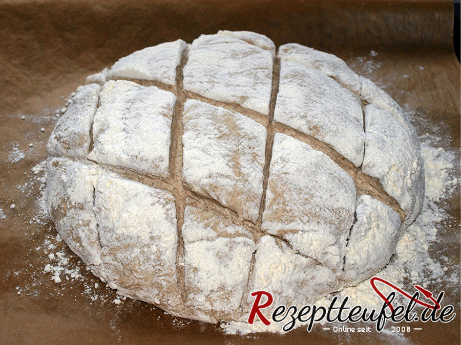 Der Teig kann sowohl als Teigkugel auf dem Blech (wie in dieser Anleitung beschrieben) oder auch in einer Kastenform gebacken werden, ganz wie man es am liebsten mag.