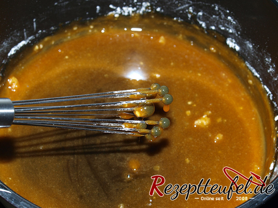 - Den Puderzucker in einen Topf geben, langsam erhitzen, bis er zu schmelzen anfängt. Der Zucker sollte solange erhitzt werden, bis er eine goldgelbe Farbe annimmt. Mit der Flüssigkeit ablöschen.