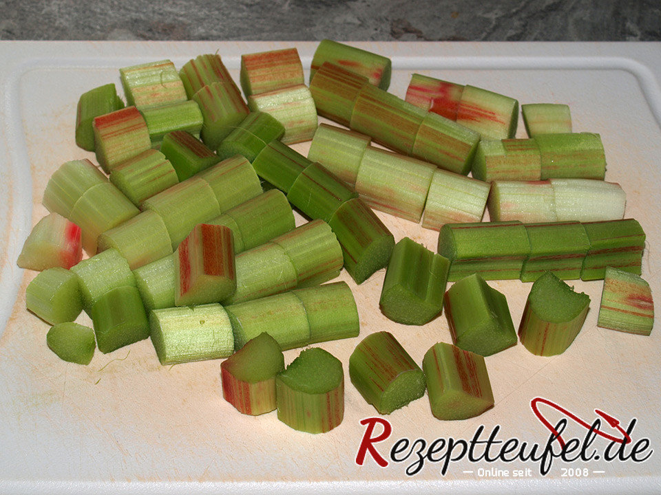 - Den Rhabarber schälen bzw. die Haut abziehen. Die Rhabarberstangen in kleine Stücke von ca. 2 - 3 cm schneiden.