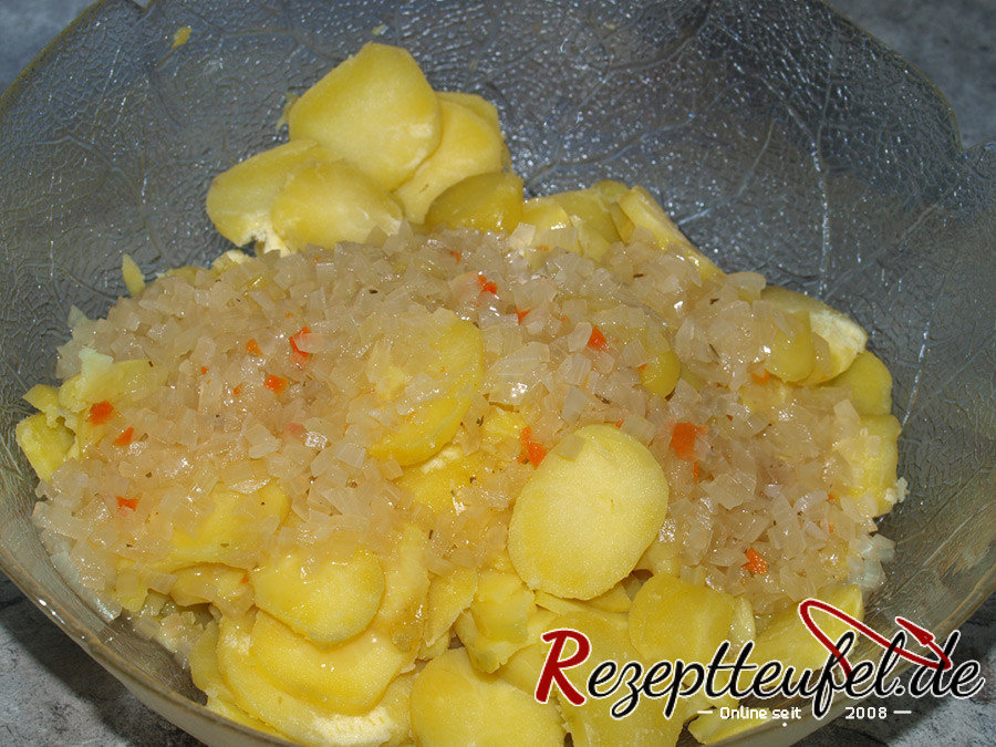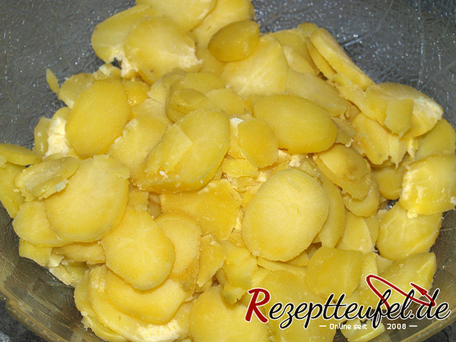 Ich verwende gerne mehlige Kartoffeln für diesen Kartoffelsalat da die mehligen Kartoffeln die Brühe besser aufsaugen, dieses ist jedoch Geschmackssache.