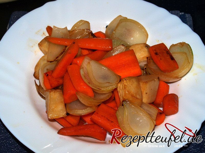 - Das Suppengrün putzen und in grobe Stücke schneiden. Die Zwiebeln schälen und vierteln. Das Öl in den Topf geben, das Gemüse inklusive der Zwiebeln hinzufügen und gut anrösten. Das Gemüse aus dem Topf nehmen und zur Seite stellen.750 g Suppengrün, 2 mittelgroße Zwiebeln, 2 EL Öl