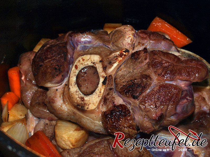 - Die Beinscheiben nacheinander in dem Topf von beiden Seiten kräftig anbraten, bis es eine schöne braune Farbe angenommen hat. Die Beinscheiben ebenfalls auf einen Teller geben und zu Seite stellen.1500 g Rinderbeinscheibe