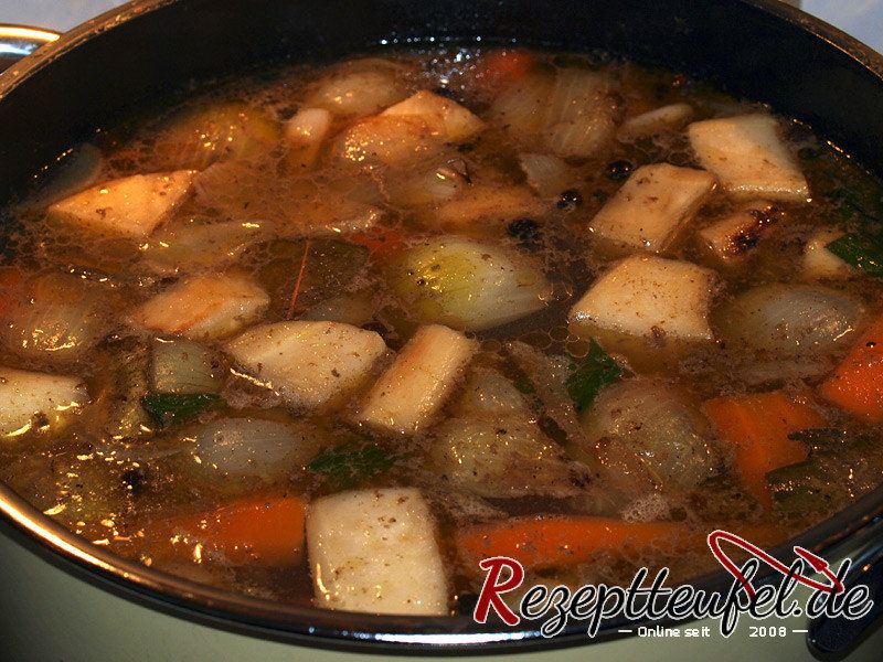 - Den Topf vom Herd nehmen und etwas abkühlen lassen. Das kalte Wasser in den Topf geben, die Beinscheiben hinzufügen und den Topfinhalt langsam zum Sieden bringen. Der sich bildende Schaum bzw. die Flocken vom Fleischeiweis auf der Wasseroberfläche mit einer Schaumkelle abschöpfen. Das Gemüse und die Gewürze hinzufügen und die Brühe ca. 2 bis 3 Stunden sieden (nicht kochen!) lassen (bei unserem Herd auf Stufe 2 von 9).5 Liter Wasser, 2-3 Blatt Liebstöckel, 2 Lorbeerblätter, 10 Pimentkörner, 10 Wacholderbeeren, 20 schwarze Pfefferkörner