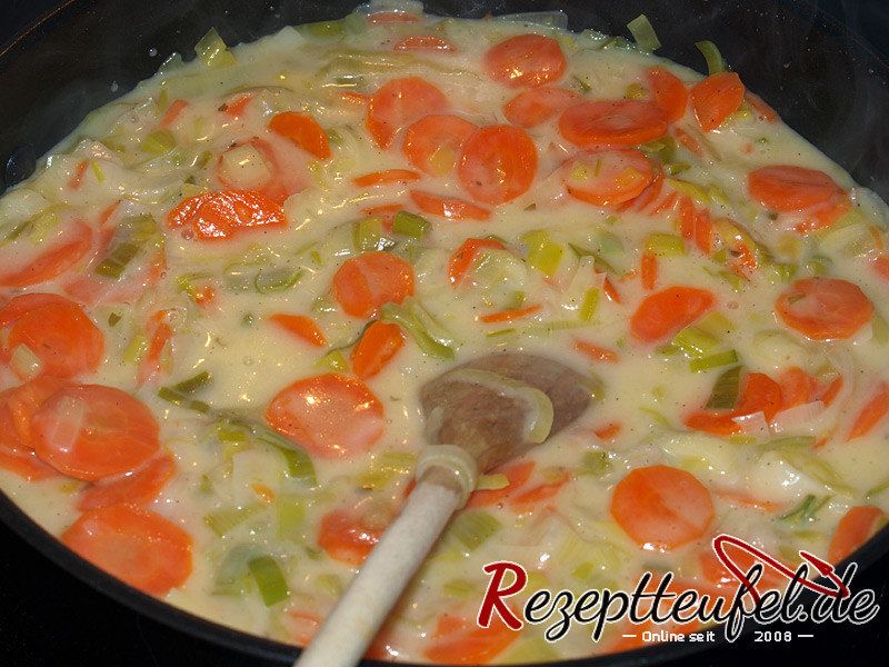 - Den geputzten Lauch in Ringe schneiden, die Möhren schälen und in feine Scheiben schneiden. Das Gemüse in einem Topf mit etwas Wasser leicht andünsten. Den Schmand dazugeben, unterrühren und mit Salz und Pfeffer würzen und in eine gefettete Auflaufform geben.200 g Lauch, 150 g Möhren, 100 g Schmand, Salz, schwarzer Pfeffer, 2-3 EL Wasser