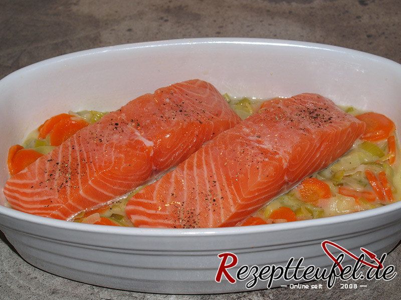 - Das Lachsfilet mit Zitronensaft beträufeln und salzen, auf das Gemüse legen und die Auflaufform auf dem Rost in den Backofen schieben und ca. 20 Minuten garen.2 Stücke Lachsfilet, 1 TL Zitronensaft