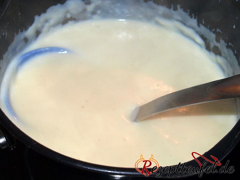 - Die Butter schmelzen lassen, das Mehl hinzufügen und kurz mit anschwitzen. Die Milch unter Rühren hinzufügen und die Soße aufkochen lassen. Mit Muskat und Salz abschmecken.