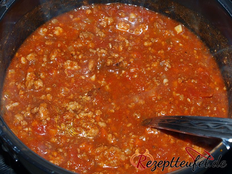 - Das vorbereitete Gemüse zum Fleisch hinzufügen und mit 250 ml Brühe ablöschen. Die Tomaten, etwas und die Lorbeerblätter hinzufügen. Den Deckel auf die Pfanne geben und die Bolognese köcheln lassen, bis sie sämig ist (mindestens 60 Minuten), dabei zwischendurch umrühren.