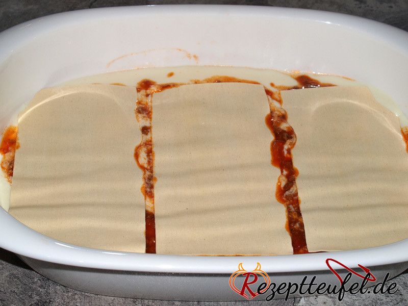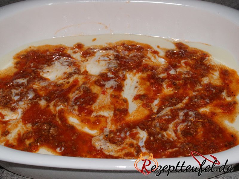 - Die 1. Schicht in der Auflaufform mit Bolognese und Béchamelsoße