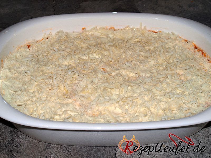 Den Parmesan reiben und gleichmäßig auf die oberste Schicht (Béchamelsoße) streuen.